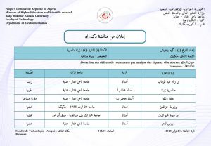 إعلان عن مناقشة أطروحة دكتوراه للطالب الباحث كريم بوعويش – قسم الكهروميكانيك 📢 PhD Thesis Defense Announcement – Karim. Bououich 11 novembre 2025 Lire plus»