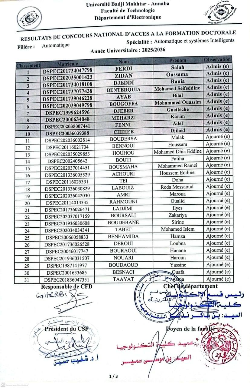 📢 كلية التكنولوجيا تعلن نتائج الالتحاق بدكتوراه الآلية Publication publiée :14 février 2026 إعلان هام تُعلن إدارة #كلية_التكنولوجيا #جامعة_باجي_مختار_عنابة عن نتائج الترتيب للالتحاق بالتكوين دكتوراه في إطار برنامج «#ترقية_المرئية» شعبة: آلية حظًا موفقًا لجميع، مع أطيب التمنيات بالنجاح والتوفيق في مسارهم الجامعي. Please Share This Partager ce contenu Ouvrir dans une autre fenêtre Ouvrir dans une autre fenêtre Ouvrir dans une autre fenêtre Ouvrir dans une autre fenêtre Read more articles Article précédentكلية التكنولوجيا تهنئ أساتذتها بمناسبة الترقية إلى أستاذ محاضر أ Article suivantإعلان نتائج الترتيب للالتحاق بدكتوراه شعبة الإعلام الآلي