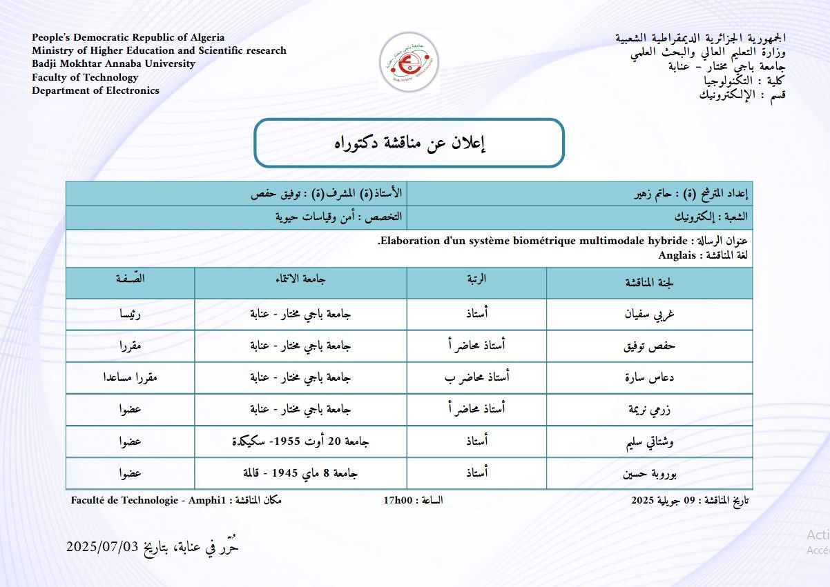 🎓✨ يسرّنا الإعلان عن مناقشة أطروحة دكتوراه للطالب حاتم زهير، تحت إشراف الأستاذ توفيق حفص، في شعبة إلكترونيك، تخصص أمن وقياسات حيوية، بكلية التكنولوجيا – قسم الإلكترونيك – جامعة باجي مختار عنابة 🇩🇿.