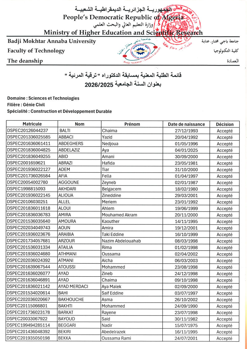 La Faculté de Technologie et le Département de Génie Civil adressent leurs encouragements à l’ensemble des candidats et leur souhaitent plein succès.
