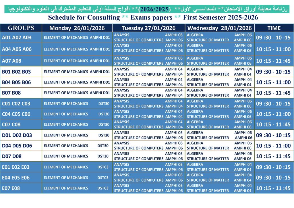 نعلم طلبتنا الأعزاء أن بداية الدروس الخاصة بالسداسي الثاني ستكون يوم الأحد الموافق لــ25 جانفي  2026.